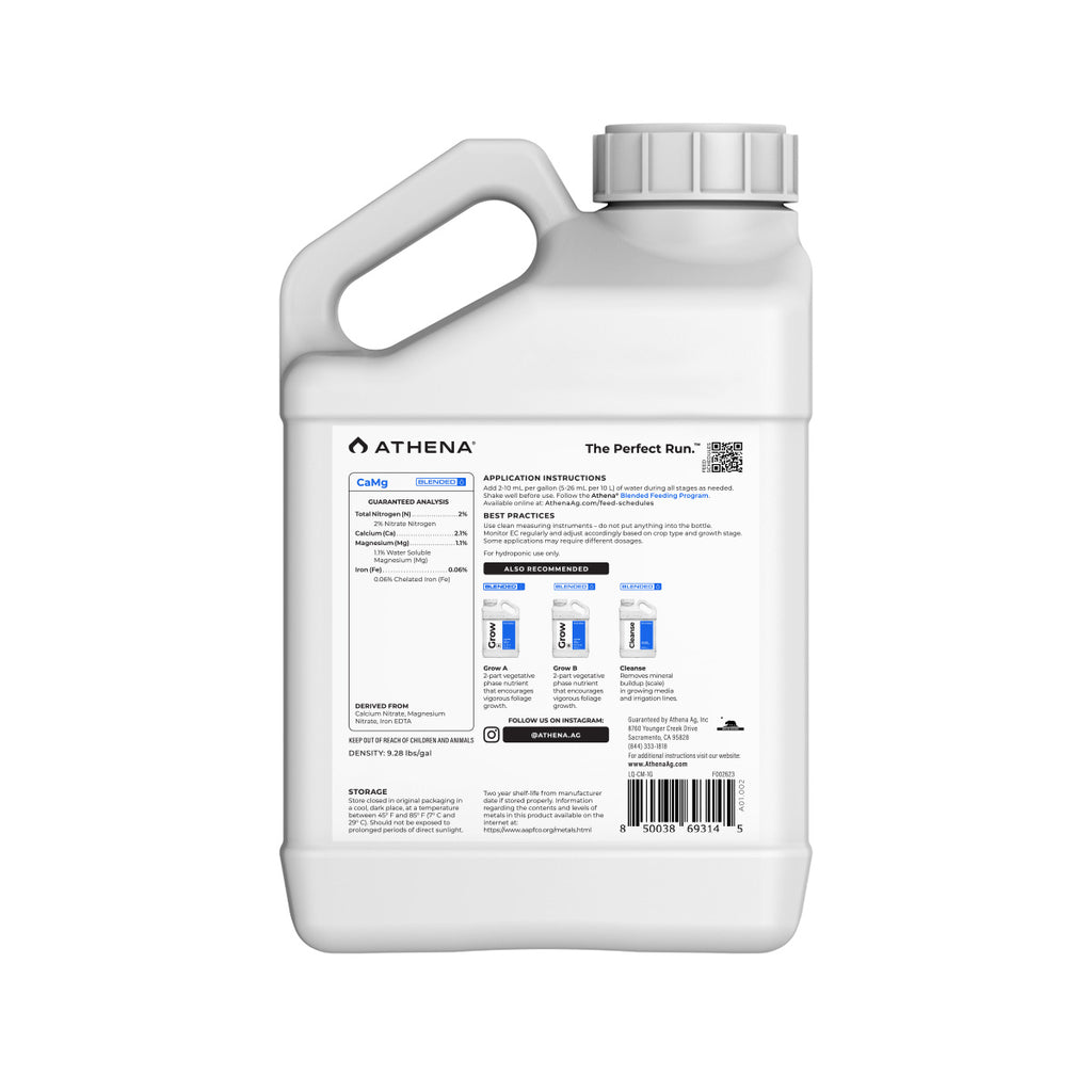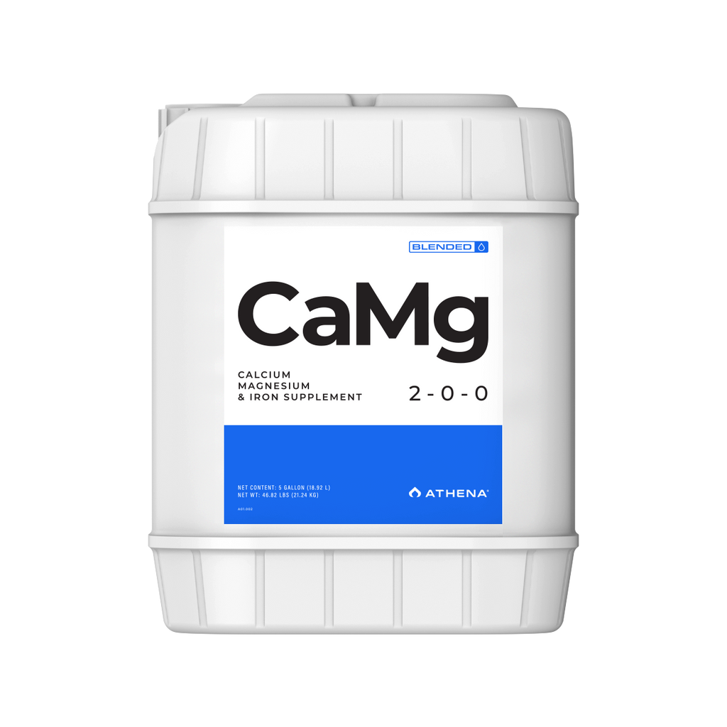 Athena CaMg is designed to supplement either of our 2-part liquid formulas. Some cultivars and growing conditions may require higher doses of calcium, magnesium, iron and nitrogen during heavy growth and development phases. This product effectively helps correct common Ca/Mg/Fe deficiencies, without throwing off overall elemental balance. In systems using reverse osmosis (RO) water and plants grown in inert media, such as coco and rockwool, Athena CaMg is particularly useful. Although our 2-part formulas already provide sufficient levels of calcium and magnesium, some growers find supplementation helpful in demanding conditions.