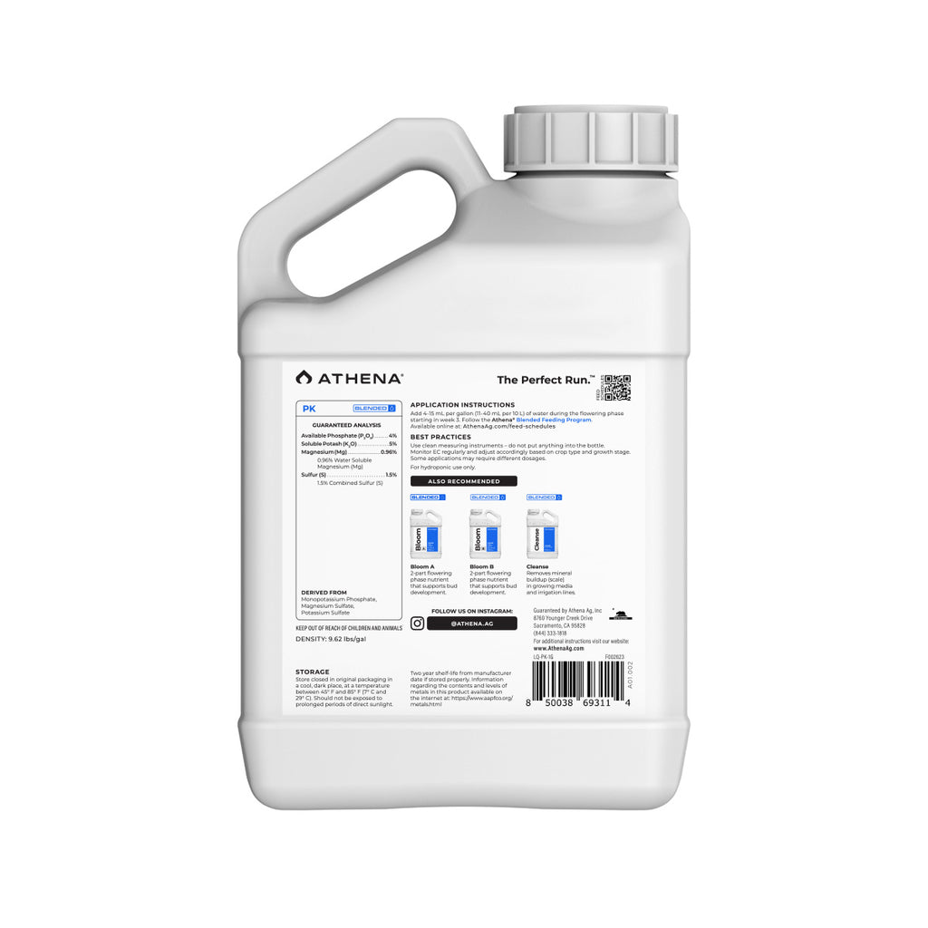 Athena PK is a bloom-boosting complement to our Bloom fertilizers. This clean liquid booster is designed to supplement during the mid- to late-flowering phase. Athena PK is a no nitrogen booster that provides additional phosphorus and potassium that high-yielding plants require for maximum production. Many PK boosters add far too much of these elements and create a cascade of problems, such as reducing calcium and magnesium availability. Balanced elemental bioavailability is essential in the flowering phase to boost essential oil and terpene production.